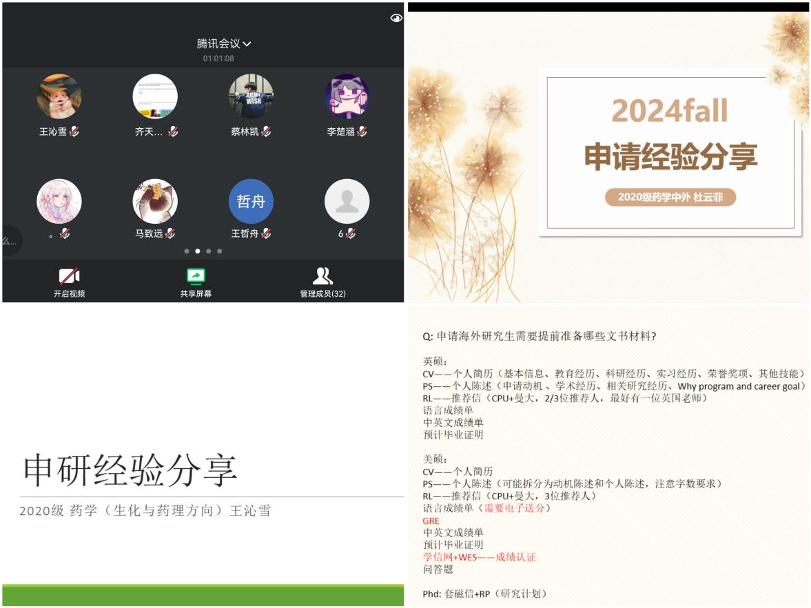 活动采用线上会议的形式开展。杜云菲同学结合自己申请2024年秋季研究生项目的经验,从文书材料准备、申请时间线、专业选择等方面进行了详细的介绍,建议同学们要尽早着手准备规划,提前准备个人简历等材料,并有针对性投递申请;王沁雪同学围绕欧洲学校研究生项目的申请,重点介绍了个人材料中科研经历、成绩要求、实习经历等的准备,并结合同学们所学专业对申请途径和优势专业进行了分析交流。会上,两位学姐针对同学们的疑问进行耐心解答和指导,同学们纷纷表示受益匪浅,要以两位优秀学姐为榜样,锤炼自我,追光前行。